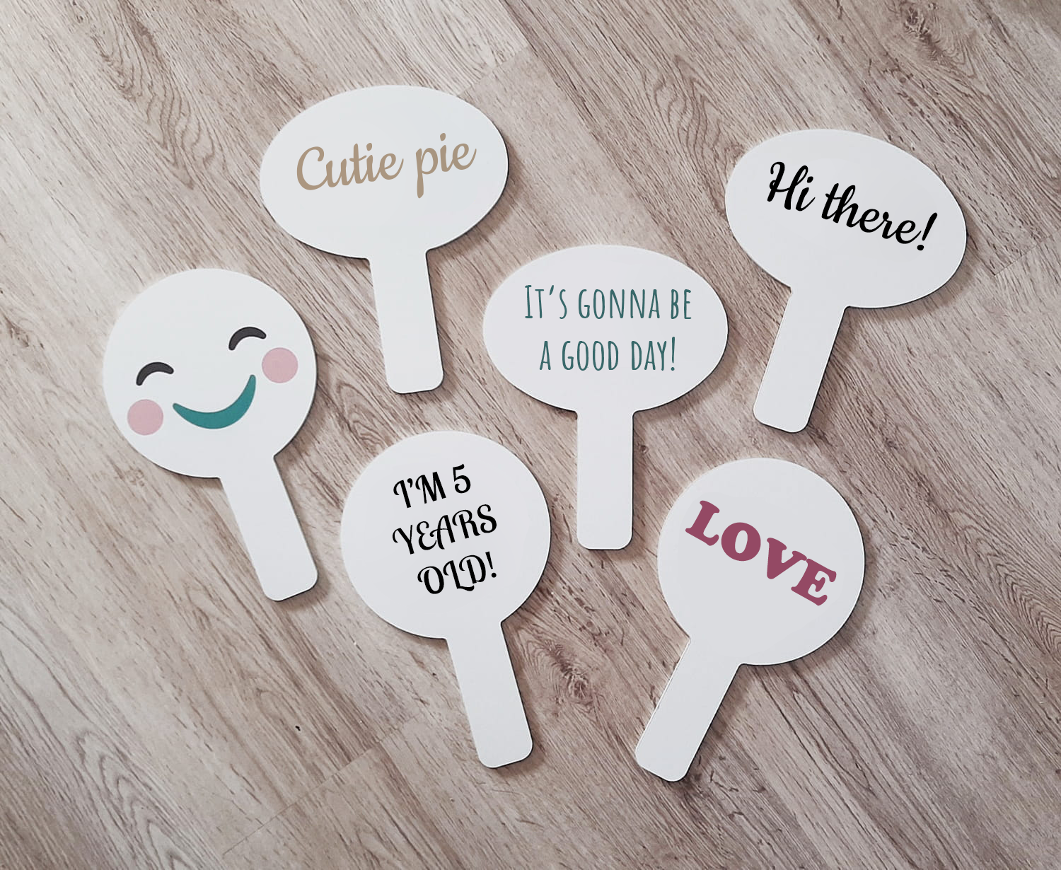 - 6 photo plaques (5 plaques with your own text, 1 emoticon plaque), size 19,5 x 24,5 cm (7.6 x 9.6 inch) and 16,5 x 27 cm (6.4 x 10.6 inch).